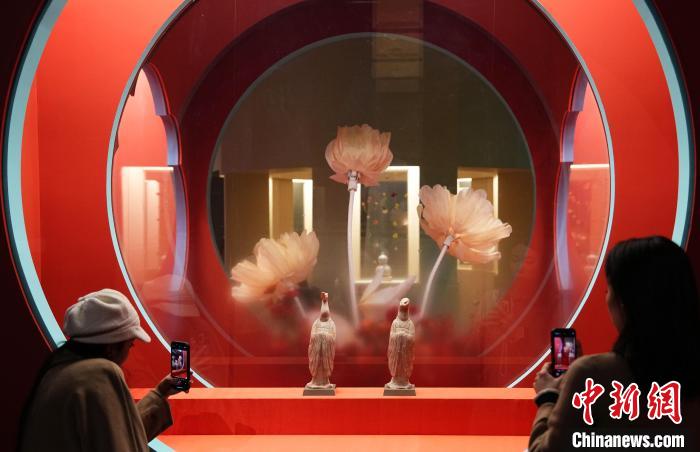 據(jù)介紹,這是蛇類紋飾作為裝飾題材出現(xiàn)在商周青銅禮器之上的一種典型代表。半人半蛇的唐代“伏羲女媧像立幅”帛畫,印證著伏羲女媧這一久遠(yuǎn)的文化信仰,通過絹帛畫形式在當(dāng)時(shí)的吐魯番地區(qū)傳播,并吸引其他民族的崇奉。此外,展廳中充滿新春氛圍感的桃花洞釉燈籠瓶、白玉“天官賜?!迸?、“好酒”白釉盤等近200余件(套)館藏文物精品,書寫著對(duì)即將到來的蛇年新春的期待和祝福。