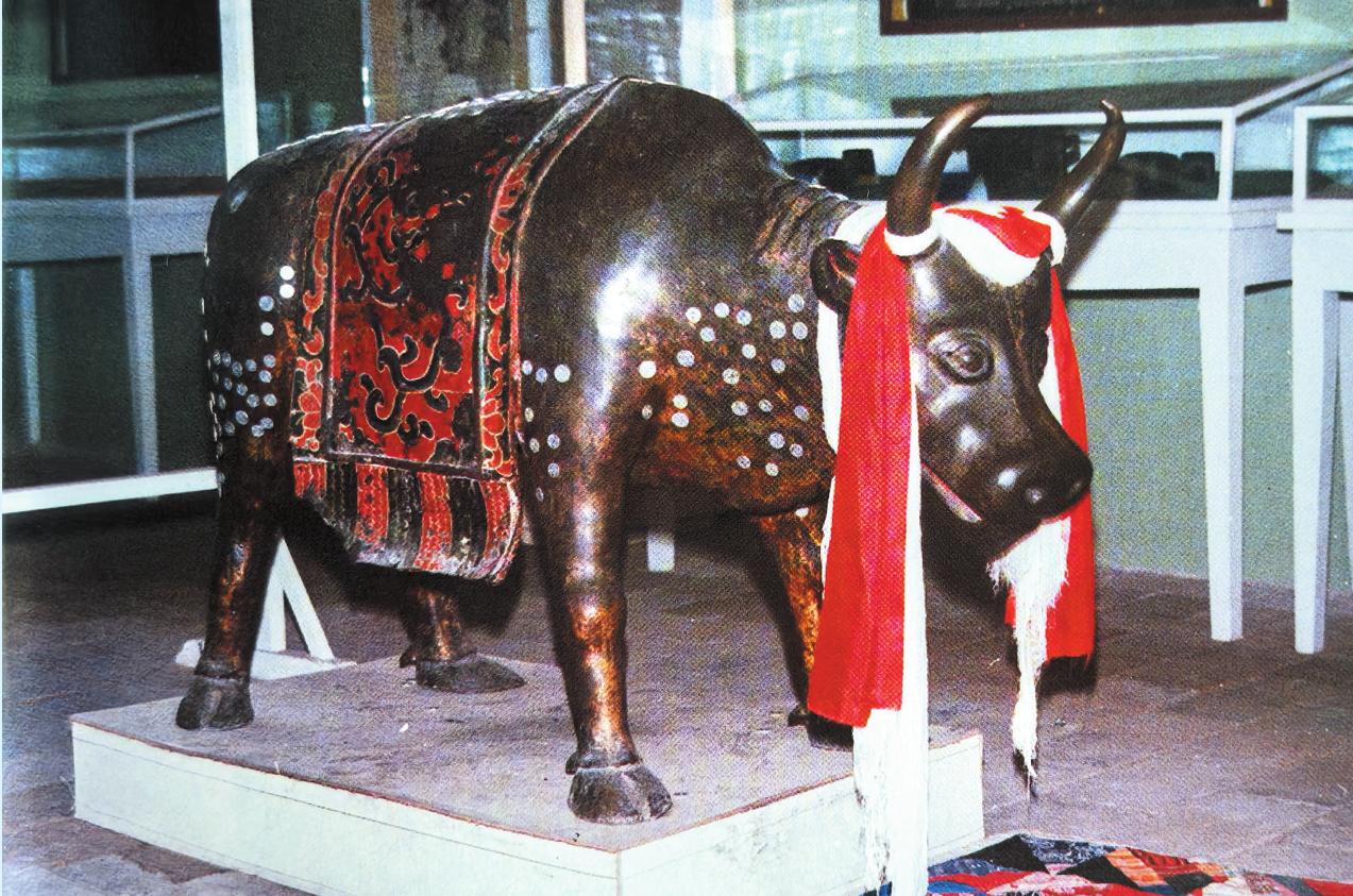 銅牛原在大社寺,因此曾被稱為“大社銅?!?。在佛教中,把三種修行的途徑比作乘坐的三種車,三車又喻為三乘,羊車喻小乘聲聞,鹿車喻中乘緣覺,牛車喻大乘菩薩。五臺(tái)山這尊銅牛、這輛銅車,正是象征著“三乘”中最為尊貴的菩薩乘。