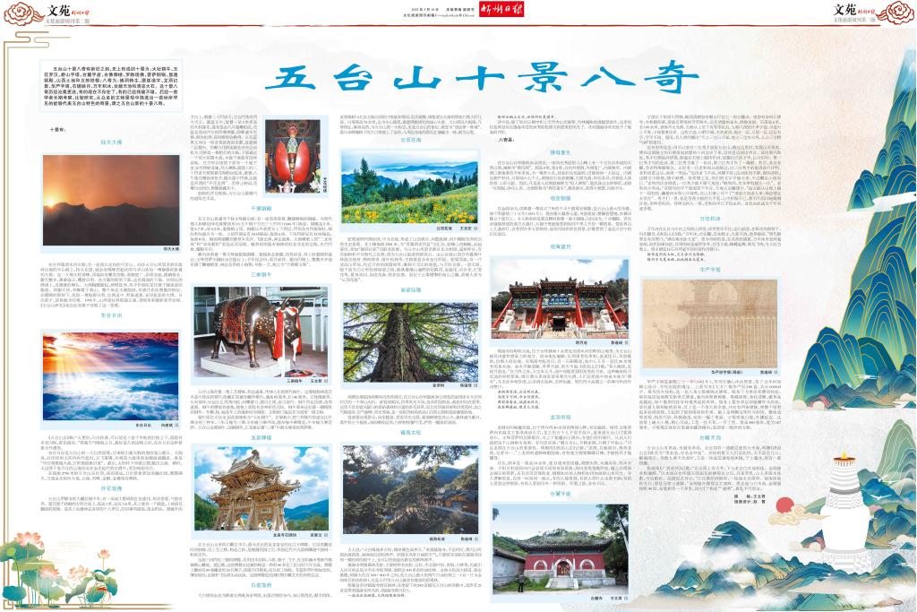 五臺(tái)山十景八奇有新舊之別,史上形成的十景為:大社銅牛、玉花羅漢、碧山字塔、臺(tái)麓字崖、古佛牌樓、羅睺現(xiàn)佛、菩薩銅鍋、顯通銅殿、山西土地和五郎鐵棍;八奇為:佛洞轉(zhuǎn)生、摩崖造字、龍洞幻景、華嚴(yán)字塔、石罅映月、萬年積冰、臺(tái)巔天池和清涼大石。這十景八奇歷經(jīng)滄桑更迭,有的現(xiàn)在不存在了,有的已經(jīng)殘破不堪。后經(jīng)一些學(xué)者長期考察,比較研究,從眾多的文物景觀中篩選出一些世所罕見的能夠代表五臺(tái)山特色的奇景,謂之五臺(tái)山新的十景八奇。