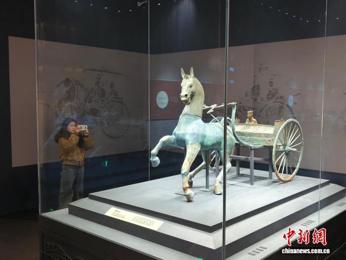 2月6日,游客在資陽市博物館打卡被譽為“中國漢代第一車”的資陽銅車馬。陳選斌 攝