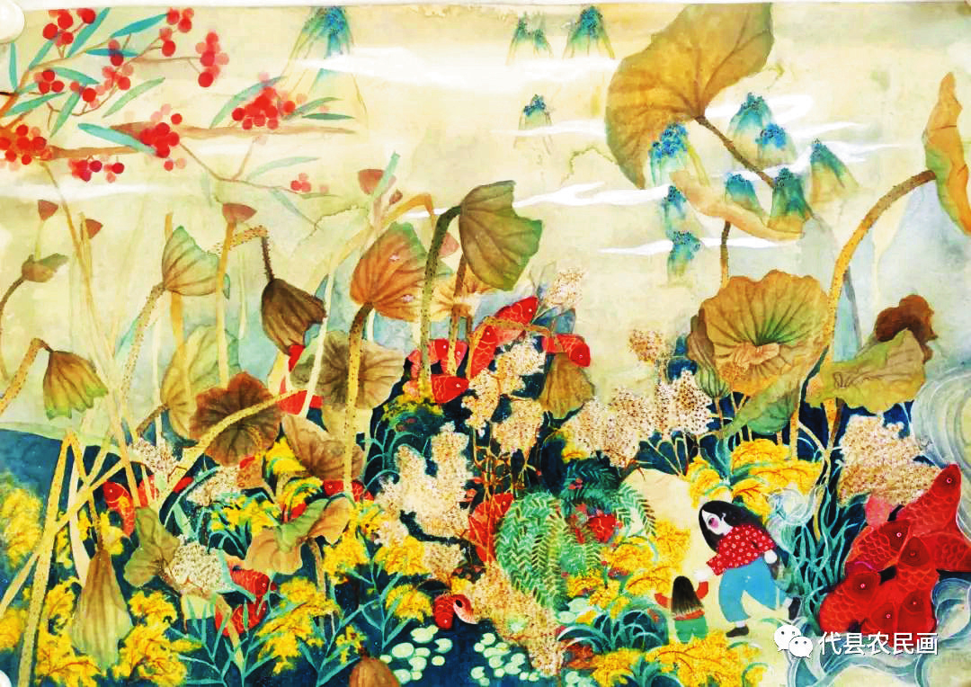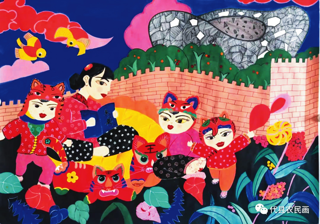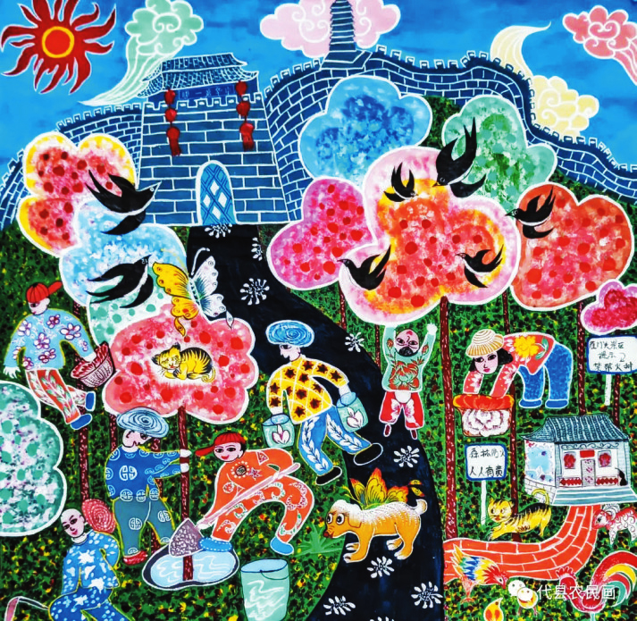中國(guó)歷史文化名城代縣,文化底蘊(yùn)深厚,民俗傳統(tǒng)技藝精巧別致,1988年和2008年先后被文化部授予“中國(guó)民間繪畫畫鄉(xiāng)”“中國(guó)民間文化藝術(shù)之鄉(xiāng)”。該縣的農(nóng)民畫早在上世紀(jì)80年代初就在全國(guó)產(chǎn)生過(guò)較大影響,之后經(jīng)歷了一段低迷期。近年來(lái)在代縣農(nóng)民畫促進(jìn)會(huì)的推動(dòng)之下,農(nóng)民畫又重新煥發(fā)出耀眼的光彩。先后涌現(xiàn)出多位畫家,其中尤以丁全愛(ài)、戴翠平、祁磊、賈永花、郎冬梅等18位女畫家組陣的雁門巾幗,在多年鉆研繪畫技巧的基礎(chǔ)上,創(chuàng)作出一幅幅特色鮮明、獨(dú)具匠心的畫作,成為閃耀三晉大地的矩陣,為傳承、弘揚(yáng)雁門文化做出了新貢獻(xiàn)。