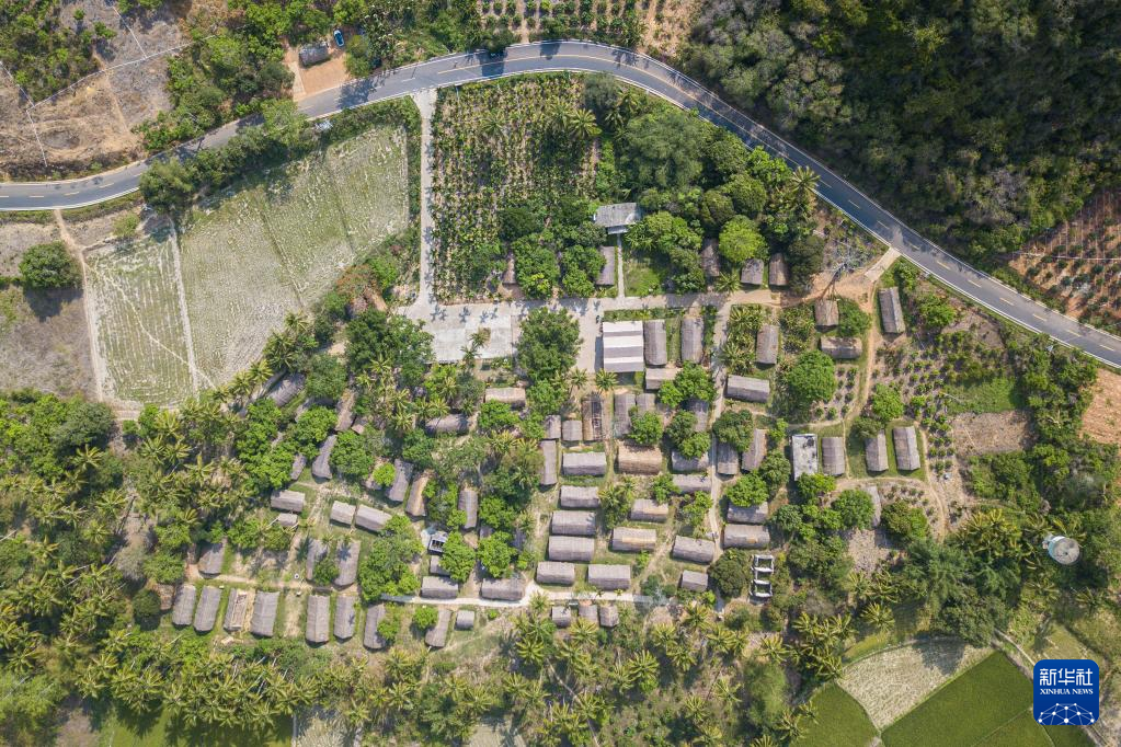 4月28日在海南省東方市白查村拍攝的黎族船型屋及近年修建的道路(無(wú)人機(jī)照片)。