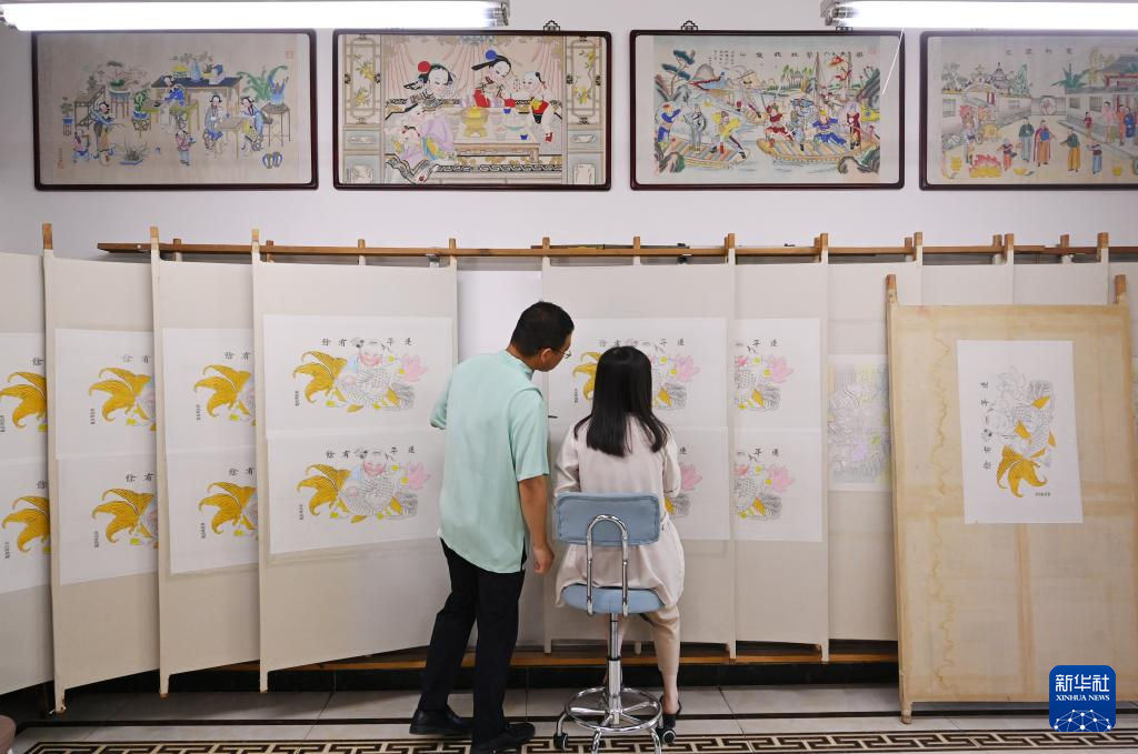 多年來,為了更好地保護(hù)傳承楊柳青木版年畫,霍樹林和父親將散落在各地的古版、畫稿搜集起來,籌建起一座年畫博物館,不同時(shí)期、風(fēng)格各異的年畫古版有上百塊?;魳淞终f:“得讓年畫從墻上‘走下來’,吸引更多年輕人的目光。”如今,他和同為傳承人的妻子王丹一起將年畫元素與現(xiàn)代文創(chuàng)相結(jié)合,設(shè)計(jì)出的團(tuán)扇、宮燈、撲克等產(chǎn)品,深受年輕消費(fèi)者喜愛。新華社記者 李然 攝