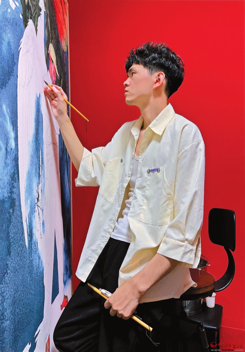 段兵美術館散發(fā)著青春的氣息,段兵的作品讓小館熠熠生輝。這里的《足記》分外引人注目。2023年6月,歷經(jīng)兩個多月,1000多個小時的繪畫創(chuàng)作,段兵的巨幅水彩創(chuàng)作《足記》誕生了。這幅作品長9米寬2.3米,是2023屆魯迅美術學院最大的畢業(yè)作品。畫作展現(xiàn)出了超強的繪畫能力與藝術想象力,作者的情感在創(chuàng)作中匯聚,令人震撼。6月23日,中央電視臺綜藝頻道對段兵進行了采訪。