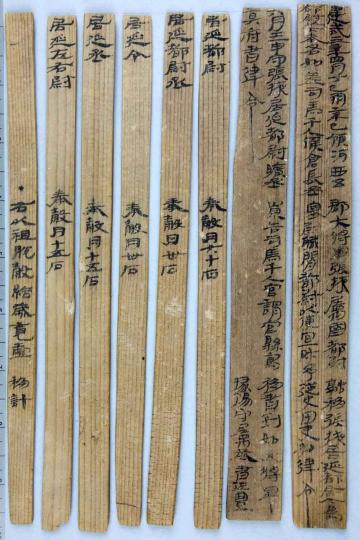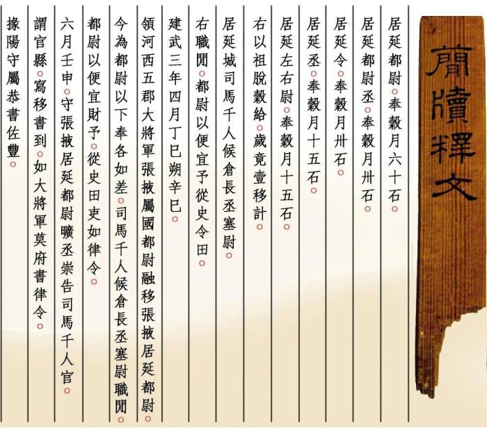 “建武三年四月丁巳朔辛巳,領(lǐng)河西五郡大將軍張掖屬國都尉融移張掖居延都尉,今為都尉以下奉各如差,司馬千人候倉長丞塞尉職閑,都尉以便宜財(cái)予,從史田吏如律令……”出土于內(nèi)蒙古額濟(jì)納旗甲渠候官遺址的《建武三年居延都尉吏奉例》由10枚簡組成,每簡長22.8厘米,前兩簡寬2.5厘米、其余8簡寬1.4厘米,全文200字。