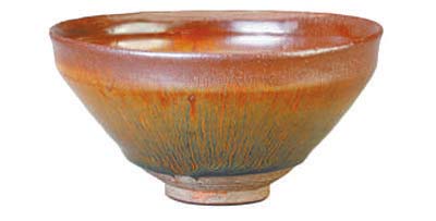 曜變建盞是建窯瓷器的名貴品種,可遇不可求,呈現(xiàn)為釉面散布大小不一的稀疏空心狀斑點(diǎn),斑點(diǎn)外緣隨光線散發(fā)出紅、綠、天藍(lán)等彩色光暈。光暈之外是流光溢彩的豎向絲毫,色彩豐富且有立體感,猶如天上的群星浩瀚深邃。
