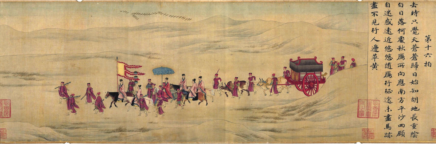 通過出土和存世的一些圖像,我們可以一窺漢代旄節(jié)之真容。洛陽燒溝61號西漢壁畫墓中的壁畫磚上繪有一持節(jié)使者;山東嘉祥武氏祠一組畫像中,描繪了漢使持節(jié)拜見王陵之母的場景,手中所持之節(jié)正是旄三重,只是看起來柄長不到八尺。至于“旄節(jié)之制”,漢代與先秦當(dāng)是有別的,將旄牛尾編成三重流蘇的制節(jié)之法始于漢,《事物紀(jì)原》載:“漢人有持節(jié),乃古旄也。然則節(jié)自周始,而旄節(jié)則起于漢也。”這種持節(jié)使的形象,在南宋人所繪《胡笳十八拍》和《迎鑾圖》等表現(xiàn)外交題材的畫作中,仍有清晰體現(xiàn),可見這種持節(jié)出使的制度在古代一直延續(xù)。