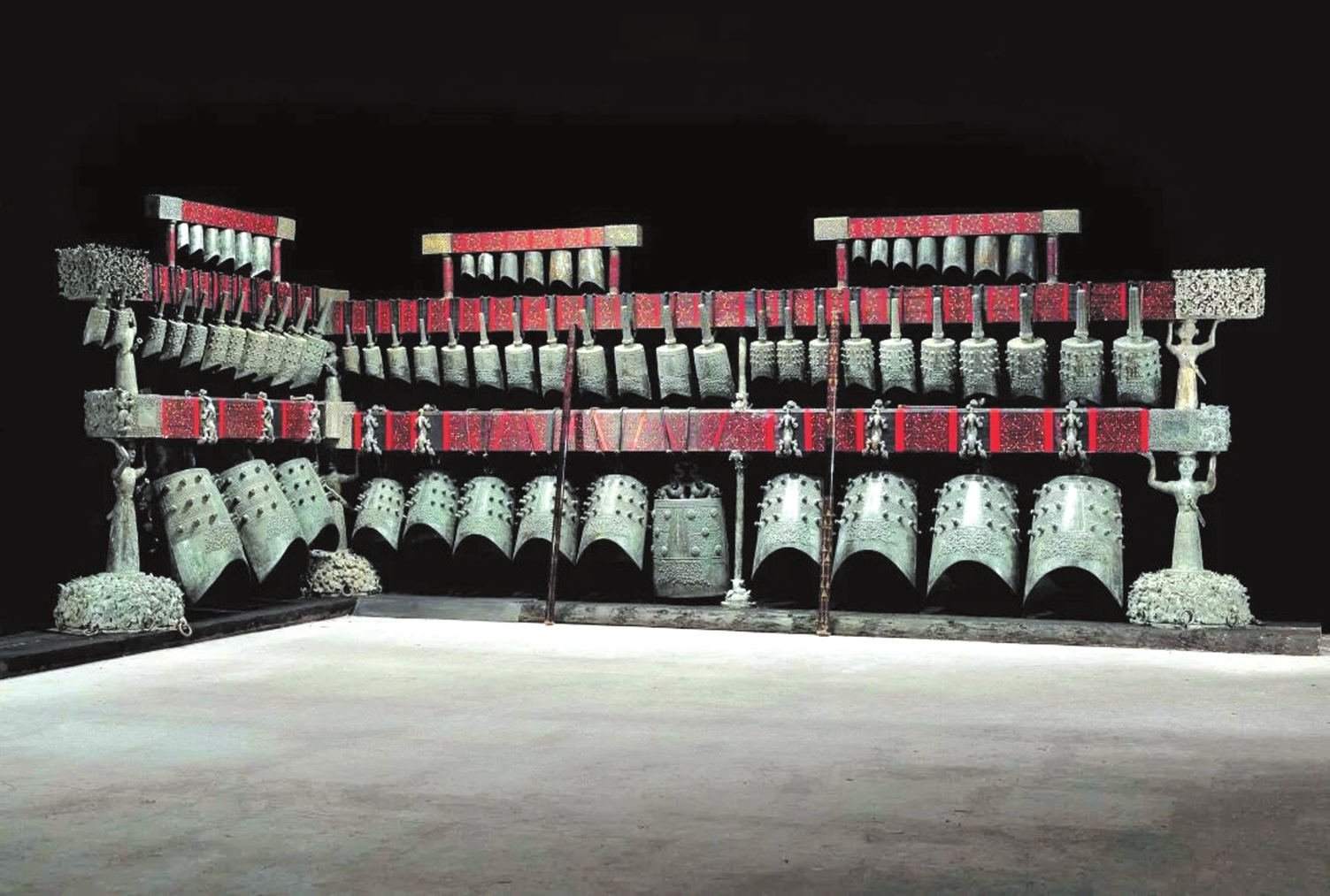 最具代表性的樂鐘無疑是“青銅之冠”的曾侯乙編鐘,它展現(xiàn)了先秦禮樂文明與青銅鑄造技術(shù)的最高成就。曾侯乙編鐘是戰(zhàn)國(guó)早期曾國(guó)國(guó)君的“禮樂重器”,1978年出土于今湖北隨州的曾侯乙墓,是迄今發(fā)現(xiàn)數(shù)量最多、保存最好、音律最全、氣勢(shì)最宏偉的一套編鐘,共65件,分3層8組懸掛于彩漆鐘架之上,鐘體總重達(dá)2.5噸。整套編鐘低音渾厚、中音圓潤(rùn)、高音清脆,音域?qū)拸V,而且中心音域內(nèi)半音齊備,可以旋宮轉(zhuǎn)調(diào),演奏各種音樂。1978年8月1日,沉寂了2400多年的曾侯乙編鐘演奏了《東方紅》《國(guó)際歌》和古曲《楚殤》、民族歌曲《草原上升起不落的太陽》等各種樂曲,樂音悠揚(yáng)回蕩。