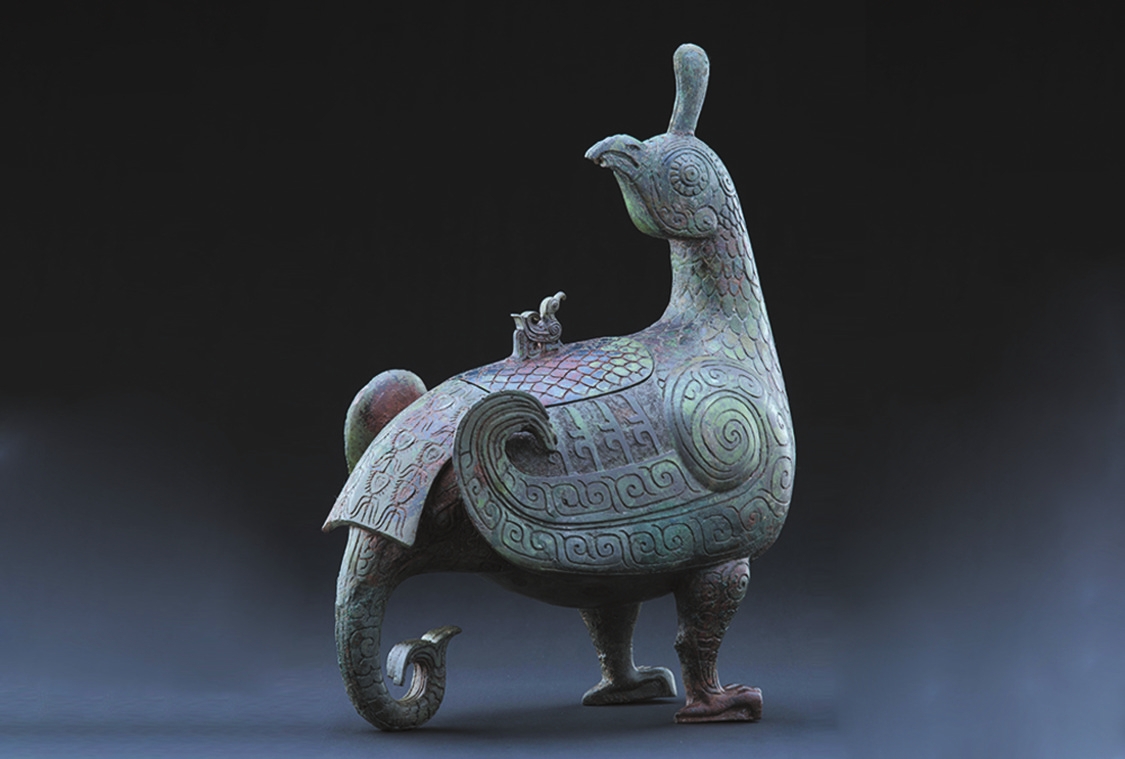 山西,東倚巍峨太行,西臨滔滔黃河,表里山河。作為中華民族的重要發(fā)祥地之一,這里地上地下的古代遺珍燦若星辰。晉侯鳥(niǎo)尊,高39厘米,長(zhǎng)30.5厘米,寬17.5厘米。整個(gè)器物以佇立回首的鳳鳥(niǎo)為主體造型,鳥(niǎo)頭微昂,圓睛凝視,高冠直立,體軀豐滿,兩翼上卷。鳥(niǎo)背依形設(shè)蓋,蓋鈕為小鳥(niǎo)形,與鳳鳥(niǎo)對(duì)望,雙腿粗壯,爪尖略蜷。全身布滿了精美紋飾,頸、腹、背裝飾羽片紋,兩翼與雙腿裝飾云紋,翼、蓋間裝飾立羽紋,以雷紋襯底,尾部裝飾華麗的羽翎紋。