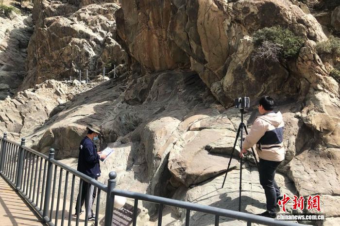 賀蘭山巖畫區(qū)域測繪與本體數(shù)字化留存項目開展期間,工作人員在賀蘭山巖畫遺址進行數(shù)據(jù)采集工作。(資料圖)銀川市賀蘭山巖畫管理處供圖