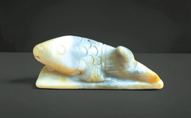 筆者藏有一件“魚躍竹排”白玉筆架,長10厘米,寬2.5厘米,高3.6厘米。筆架雕一碩大魚兒躍于竹排之上,以雙鰭為支撐,魚尾舒展,一側貼于排面,另一側微微傾斜向上、向左卷曲,恰好承筆;魚頭昂揚,宛如一幅魚乘竹排、暢游河中的立體畫卷。
