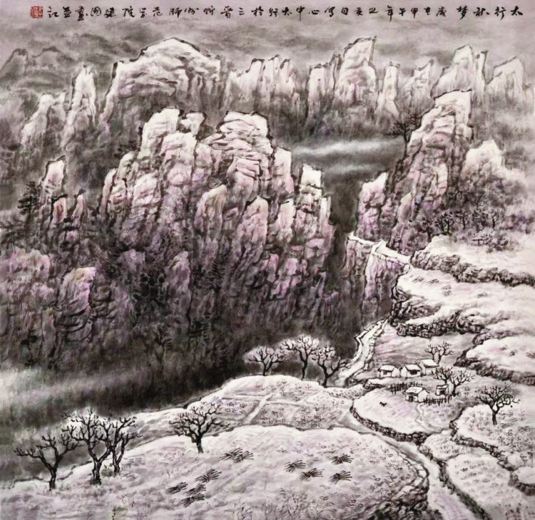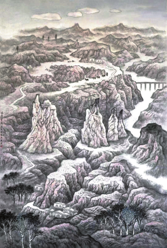 周建國對中國山水畫有著獨特見解,出版過畫集《中國美術(shù)名家精品鑒賞·周建國作品集》。他的創(chuàng)作之路主要分為兩個時期,前期追求中西融合,后期則回歸傳統(tǒng)。前期作品《曉月》《古原除夕》《月色》等,多取材于黃土高原,真切流露出其對黃土地的深情厚愛:早上飄起的炊煙演繹著百姓的勤勞,喧鬧的腰鼓彰顯著鄉(xiāng)民熱愛生活的豪情,晨起上課的學(xué)生更是承載著當(dāng)?shù)厝藵M滿的希望。周建國將黃土地上的一草一木皆升華為獨特且富有個性的生命體,畫面處理側(cè)重將西方油畫的光影巧妙融入作品,寓動于靜,動靜相宜,彰顯“高貴的單純,靜穆的偉大”的內(nèi)在張力。同時將傳統(tǒng)山水繪畫的造型、空間結(jié)構(gòu)、筆法設(shè)色皆進(jìn)行改變——黃土溝壑的幾何化處理、筆墨色調(diào)的反復(fù)拿捏、耐人尋味的空間布局,都體現(xiàn)了其特殊的創(chuàng)作理念。相較前期,周建國后期的作品更加注重對內(nèi)在美的挖掘,如《風(fēng)月同天》《家園》《和諧家園》《生息之地》《太行月色》等代表作品,表達(dá)對祖國山河大川的熱愛,走“外師造化,中得心源”之道,畫風(fēng)趨向率真,試圖突破中國山水繪畫的表象審美,追尋深層意義的表達(dá)。