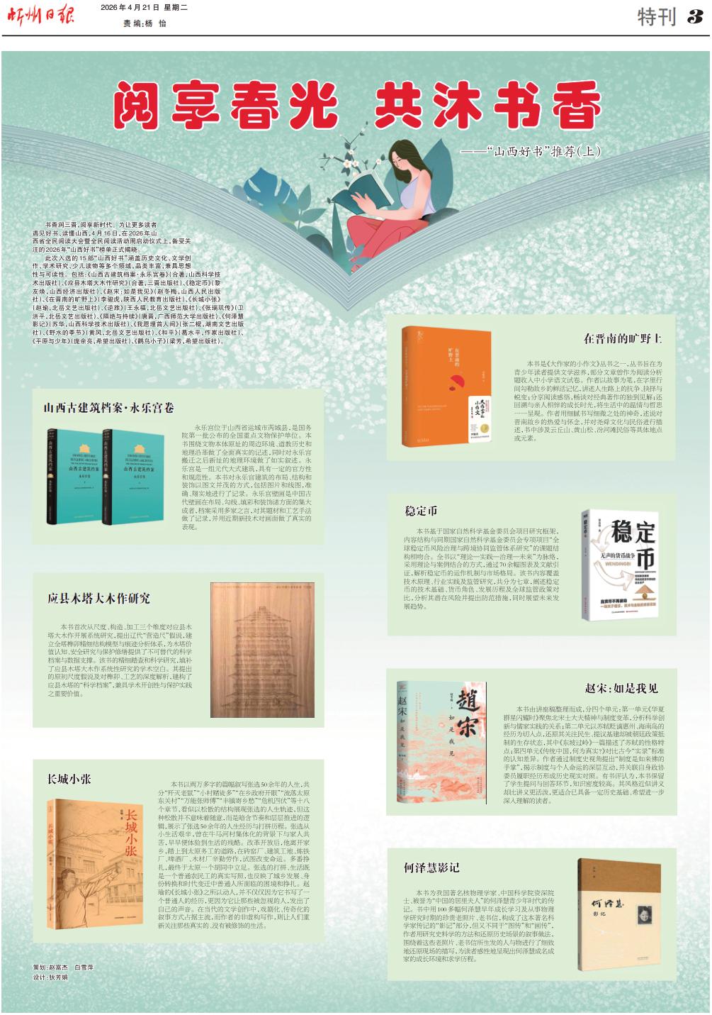 書香潤三晉,閱享新時代。為讓更多讀者遇見好書、讀懂山西,4月16日,在2026年山西省全民閱讀大會暨全民閱讀活動周啟動儀式上,備受關(guān)注的2026年“山西好書”榜單正式揭曉。 此次入選的15部“山西好書”涵蓋歷史文化、文學創(chuàng)作、學術(shù)研究、少兒讀物等多個領(lǐng)域,品類豐富,兼具思想性與可讀性。包括:《山西古建筑檔案·永樂宮卷》(合著,山西科學技術(shù)出版社)、《應縣木塔大木作研究》(合著,三晉出版社)、《穩(wěn)定幣》(黎友煥,山西經(jīng)濟出版社)、《趙宋:如是我見》(趙冬梅,山西人民出版社)、《在晉南的曠野上》(李駿虎,陜西人民教育出版社)、《長城小張》(趙瑜,北岳文藝出版社)、《逆旅》(王永福,北岳文藝出版社)、《張瑞璣傳》(衛(wèi)洪平,北岳文藝出版社)、《隔絕與持續(xù)》(唐晉,廣西師范大學出版社)、《何澤慧影記》(蘇華,山西科學技術(shù)出版社)、《我愿埋首人間》(張二棍,湖南文藝出版社)、《野水的季節(jié)》(黃風,北岳文藝出版社)、《和平》(葛水平,作家出版社)、《平原與少年》(龐余亮,希望出版社)、《鸛鳥小子》(梁芳,希望出版社)。 山西古建筑檔案·永樂宮卷