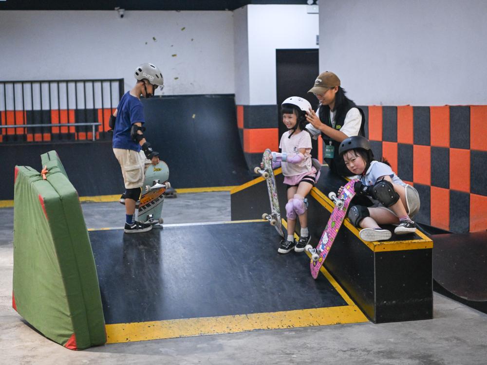 7月17日,閤靈暄(左二)正在進(jìn)行滑板訓(xùn)練。新華社記者 王曦 攝