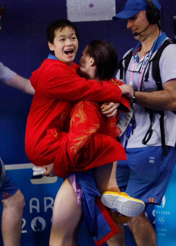 7月31日,冠軍中國選手陳芋汐/全紅嬋(左)慶祝勝利。新華社記者 張玉薇 攝