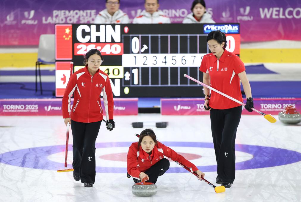 同樣在塔佐利冰上運動中心進行的還有冰壺比賽,由北京體育大學學生尹子怡、渠偌萱、譚斯婷、裴君杭、葉紫萱組成的中國女隊,先是在白天的比賽中以4:6不敵日本隊,隨后又在晚間的最后一輪循環(huán)賽中以3:6不敵加拿大隊,最終以5勝4負的成績排名循環(huán)賽第五,無緣四強。