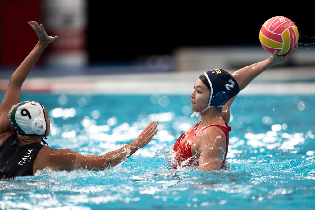 中國隊在交叉賽中遭遇世界排名第七的意大利隊,雙方一開場就開始在水中“肉搏”,比拼防守。第一節(jié)中國隊以0:2落后。次節(jié)中國隊逐漸找到進(jìn)攻節(jié)奏,由王詩蘊(yùn)率先破門,此后雙方你來我往,交替得分。張育綿、周尚、張玘鑠的進(jìn)球幫助中國隊緊咬比分,半場結(jié)束中國隊5:6落后。