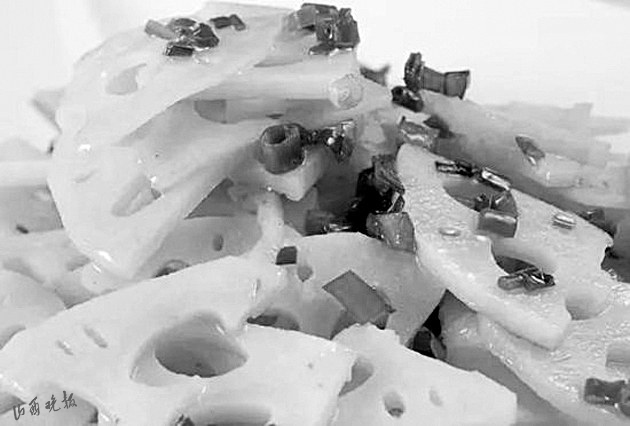 民俗流傳中,人們借助于蓮藕的特征和諧音賦予了它更多的吉祥內(nèi)容。古太原地區(qū)的傳統(tǒng)筵席“八碟八碗”中,有一款坐底大菜——涼拌蓮菜(本地人叫藕根大片)。之所以如此安排,完全就是沿用了諧音吉祥的民俗習慣?!芭骸迸c“偶”諧音,藕根大片占個“偶”,有佳偶天生的美好寓意,故而成了八大碗中必不可少的一道菜品。“蓮菜”又諧音“連財”,意思是菜上完了,還有扯不斷、沒完沒了的財運,八碗帶財一起來。寓意如此美好,自然人人都滿意。