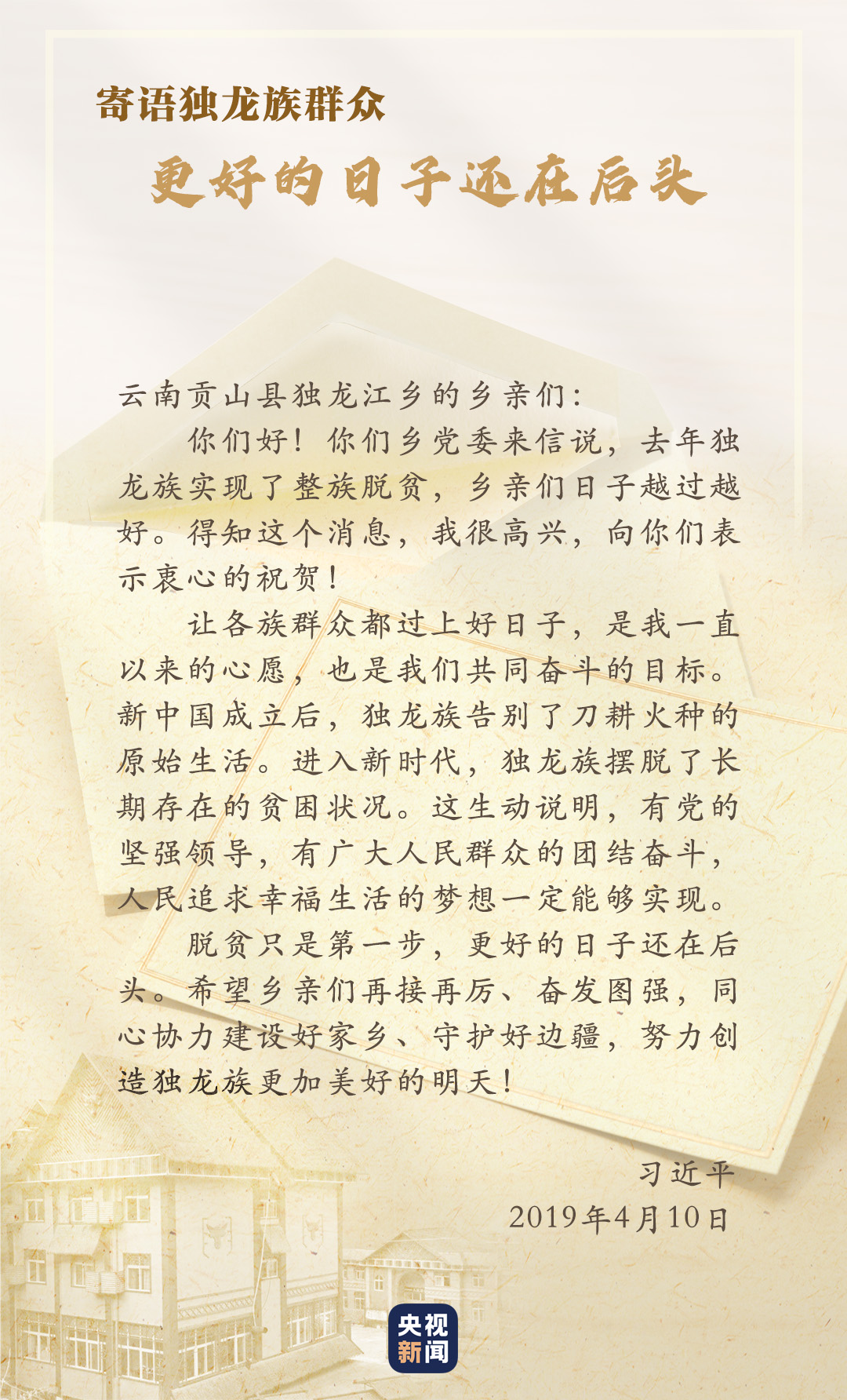 2018年,獨龍江鄉(xiāng)6個行政村整體脫貧,獨龍族實現(xiàn)整族脫貧,基礎設施、特色產業(yè)、社會事業(yè)等都發(fā)生了巨大變化。貢山縣干部群眾再次給習近平寫信匯報脫貧成績,習近平得知后非常高興,向他們表示“衷心的祝賀”,并勉勵鄉(xiāng)親們?yōu)檫^上更加幸福美好的生活繼續(xù)團結奮斗。