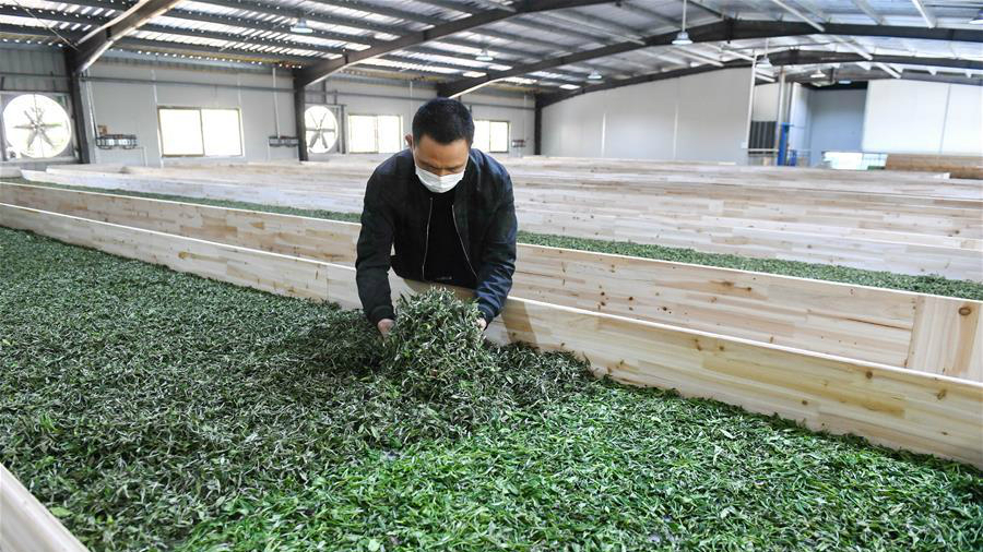 △下黨鄉(xiāng)村民在茶葉生產車間內進行壽寧白茶的曬青。