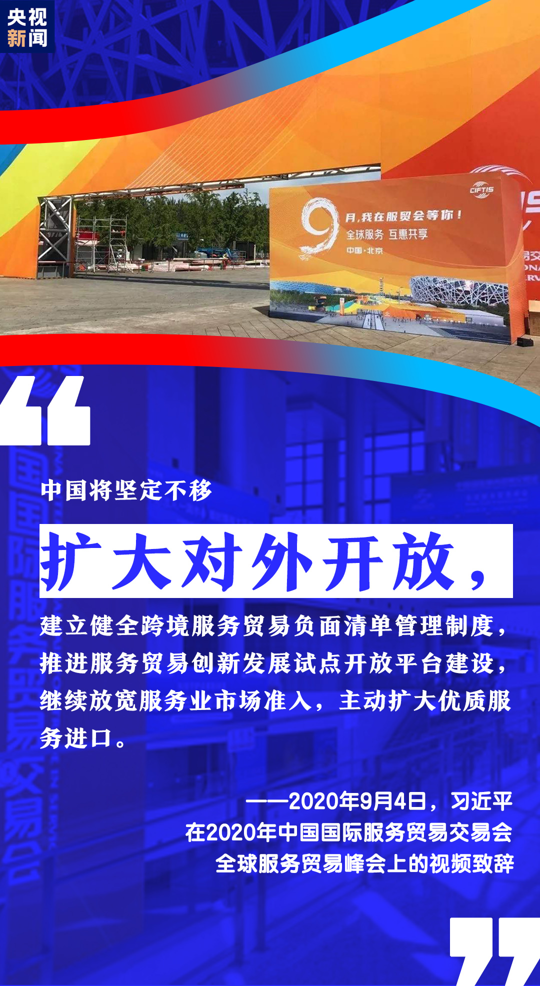 習(xí)近平表示,中國(guó)將堅(jiān)定不移擴(kuò)大對(duì)外開(kāi)放,繼續(xù)放寬服務(wù)業(yè)市場(chǎng)準(zhǔn)入,發(fā)展服務(wù)貿(mào)易新業(yè)態(tài)新模式,支持組建全球服務(wù)貿(mào)易聯(lián)盟,支持北京打造國(guó)家服務(wù)業(yè)擴(kuò)大開(kāi)放綜合示范區(qū),帶動(dòng)形成更高層次改革開(kāi)放新格局。
