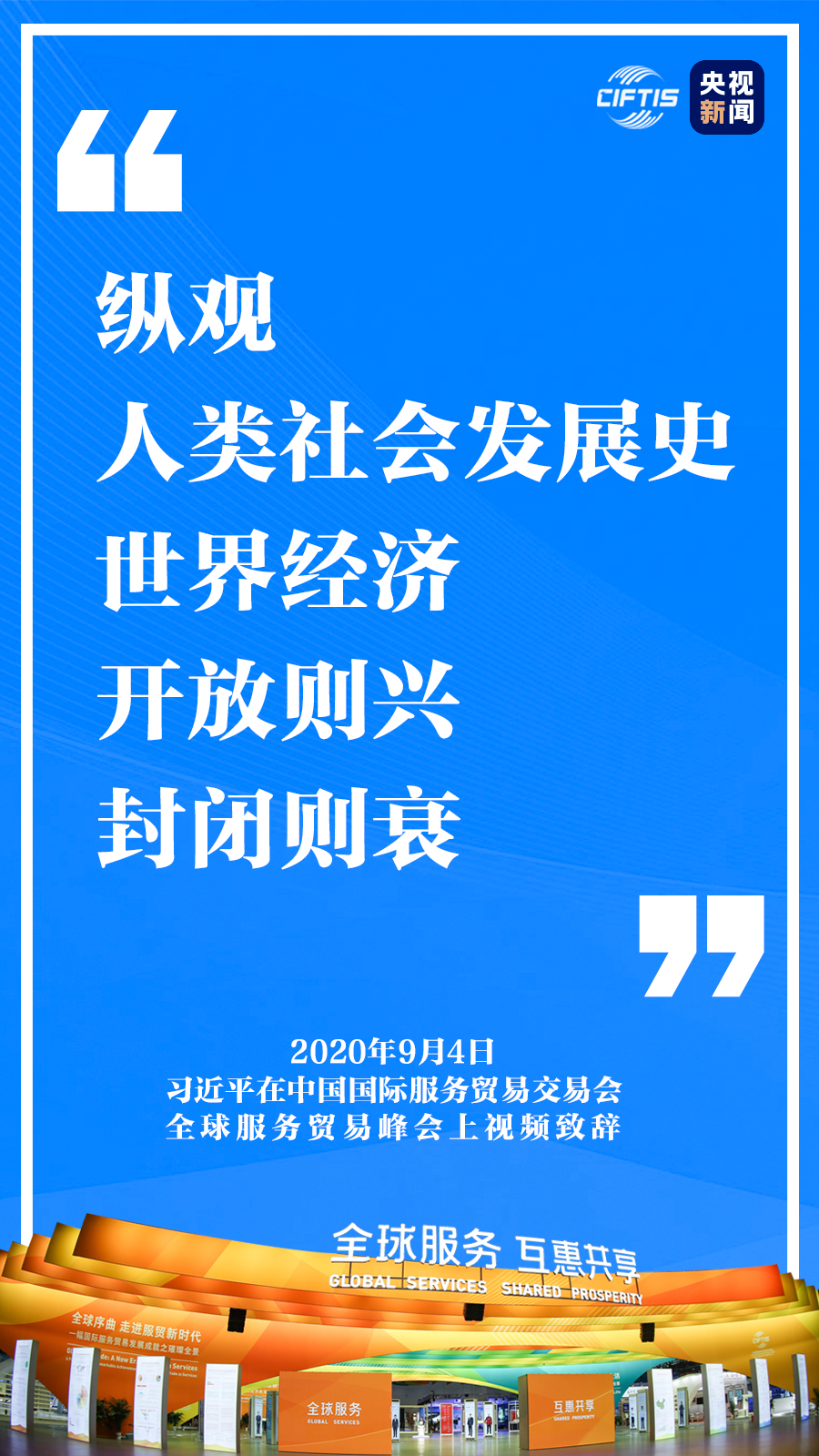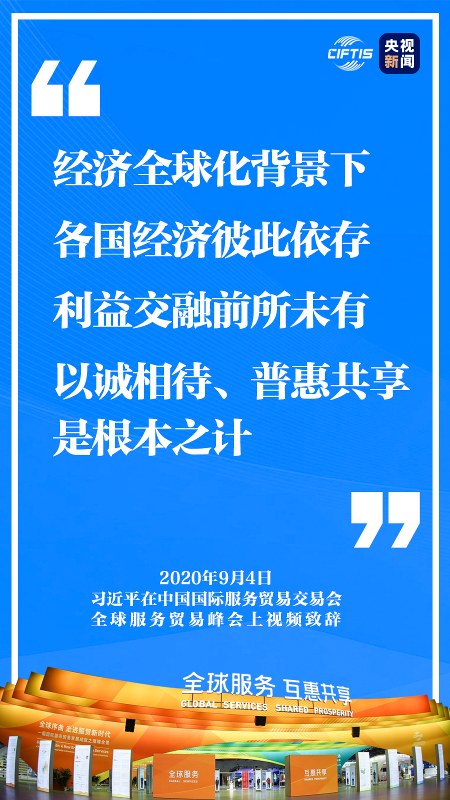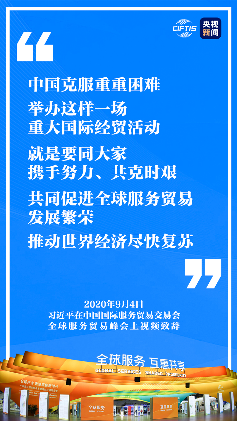 9月4日,國(guó)家主席習(xí)近平在2020年中國(guó)國(guó)際服務(wù)貿(mào)易交易會(huì)全球服務(wù)貿(mào)易峰會(huì)上視頻致辭。 挑戰(zhàn)與考驗(yàn) 當(dāng)今世界正在經(jīng)歷百年未有之大變局。新冠肺炎疫情全球大流行使這個(gè)大變局加速變化,經(jīng)濟(jì)全球化遭遇逆流,保護(hù)主義、單邊主義上升,世界經(jīng)濟(jì)低迷,國(guó)際貿(mào)易和投資大幅萎縮,給人類(lèi)生產(chǎn)生活帶來(lái)前所未有的挑戰(zhàn)和考驗(yàn)。 機(jī)遇與發(fā)展 這次疫情全球大流行期間,遠(yuǎn)程醫(yī)療、在線教育、共享平臺(tái)、協(xié)同辦公、跨境電商等服務(wù)廣泛應(yīng)用,對(duì)促進(jìn)各國(guó)經(jīng)濟(jì)穩(wěn)定、推動(dòng)國(guó)際抗疫合作發(fā)揮了重要作用。放眼未來(lái),服務(wù)業(yè)開(kāi)放合作正日益成為推動(dòng)發(fā)展的重要力量。 重要意義 中國(guó)克服重重困難,舉辦這樣一場(chǎng)重大國(guó)際經(jīng)貿(mào)活動(dòng),就是要同大家攜手努力、共克時(shí)艱,共同促進(jìn)全球服務(wù)貿(mào)易發(fā)展繁榮,推動(dòng)世界經(jīng)濟(jì)盡快復(fù)蘇。