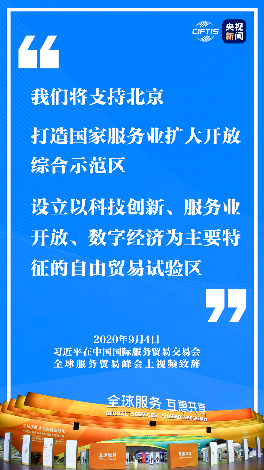 中國(guó)舉措: 中國(guó)將充分利用中國(guó)國(guó)際服務(wù)貿(mào)易交易會(huì)、中國(guó)國(guó)際進(jìn)口博覽會(huì)等各類(lèi)平臺(tái),建立和培育政府間、國(guó)際組織、商協(xié)會(huì)及企業(yè)間多樣化伙伴關(guān)系,支持組建全球服務(wù)貿(mào)易聯(lián)盟,使各國(guó)人民共同享有服務(wù)貿(mào)易增長(zhǎng)成果。 一個(gè)行動(dòng) 我們將支持北京打造國(guó)家服務(wù)業(yè)擴(kuò)大開(kāi)放綜合示范區(qū),設(shè)立以科技創(chuàng)新、服務(wù)業(yè)開(kāi)放、數(shù)字經(jīng)濟(jì)為主要特征的自由貿(mào)易試驗(yàn)區(qū)。
