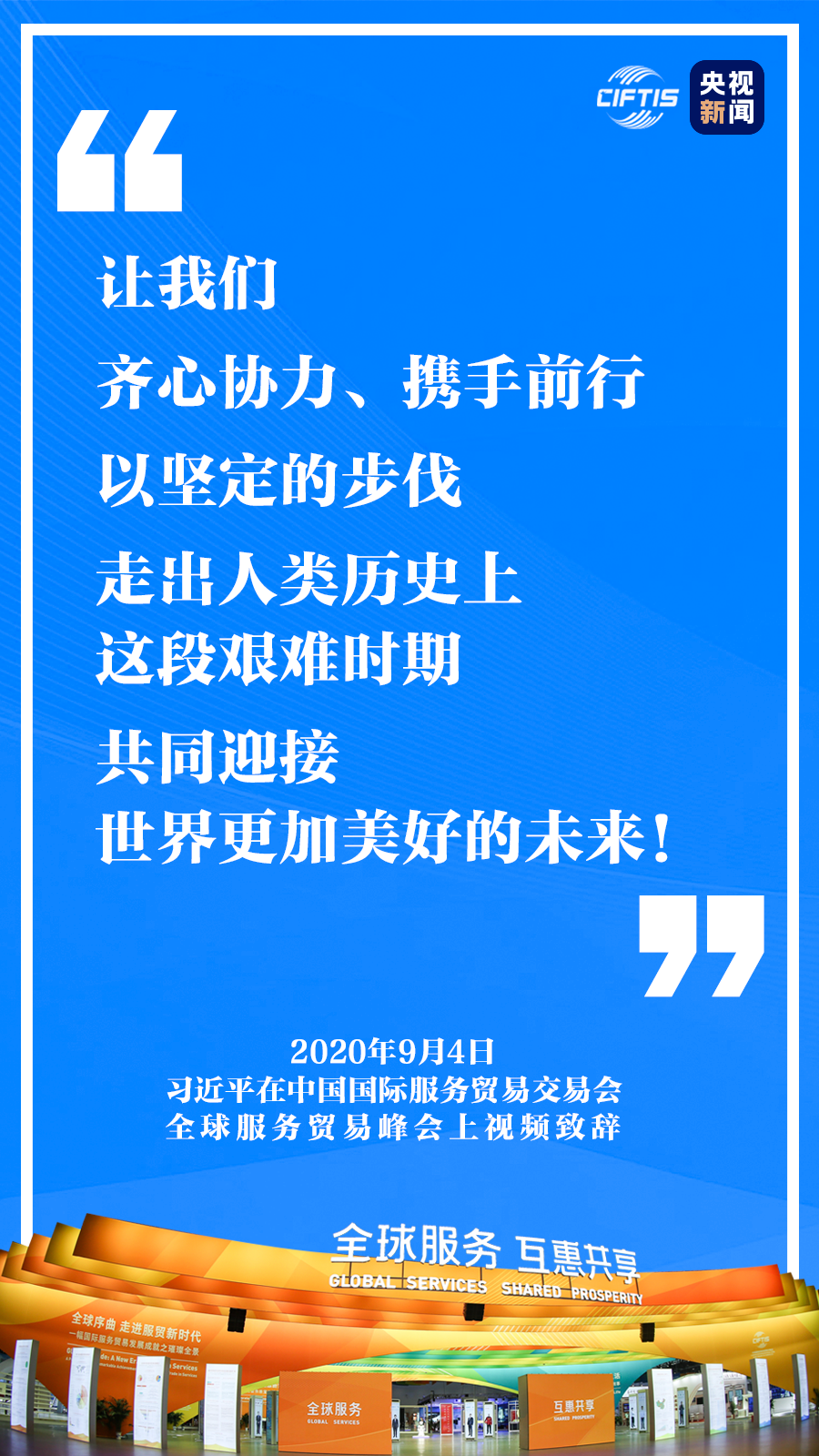 一個(gè)愿望 突如其來(lái)的新冠肺炎疫情,在一段時(shí)間內(nèi)阻隔了我們的相聚,但阻擋不了服務(wù)貿(mào)易發(fā)展的腳步,阻斷不了我們攜手共進(jìn)、合作共贏的信心和行動(dòng)! 讓我們齊心協(xié)力、攜手前行,以堅(jiān)定的步伐走出人類(lèi)歷史上這段艱難時(shí)期,共同迎接世界更加美好的未來(lái)!