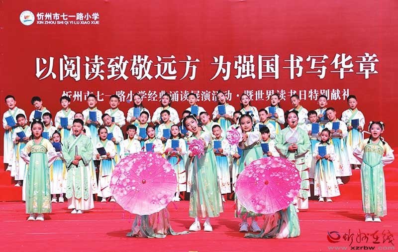 4月20日,忻州市七一路小學(xué)舉辦“以閱讀致敬遠(yuǎn)方 為強(qiáng)國(guó)書寫華章”經(jīng)典誦讀展演,獻(xiàn)禮世界讀書日,童聲誦經(jīng)典,書香潤(rùn)校園。(記者 張存良攝)