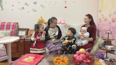 臨汾記者站記者郭玉琴(左二)在臨汾市水門街采訪“洋媳婦”扎拉過中國年。
