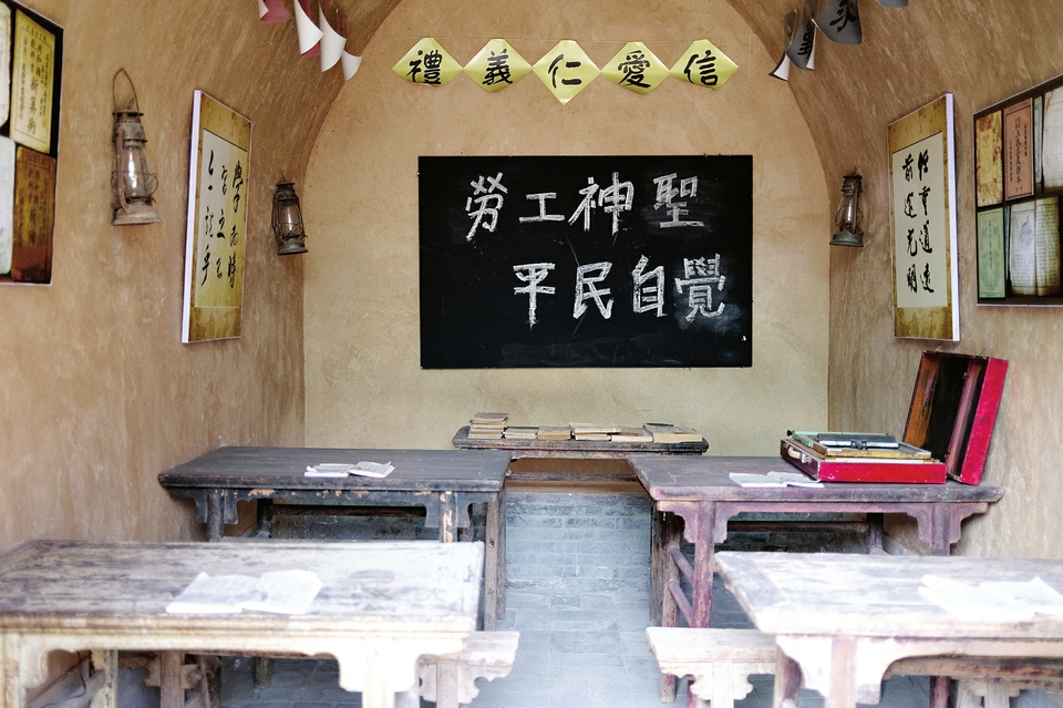 推開堆云洞一層側(cè)院展廳木門,明媚的陽光照進(jìn)教室,黑板上“勞工神圣平民自覺”8個(gè)粉筆字赫然在目,老舊的桌椅、殘留的坑道、銹跡斑斑的馬燈,雖已被時(shí)間抹去了原有的模樣,但仍時(shí)刻警醒著后人勿忘國(guó)恥。