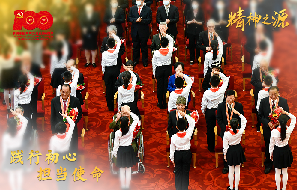 6月29日,慶祝中國共產(chǎn)黨成立100周年“七一勛章”頒授儀式在北京人民大會(huì)堂金色大廳隆重舉行。這是少先隊(duì)員向勛章獲得者獻(xiàn)花,敬禮致意。
