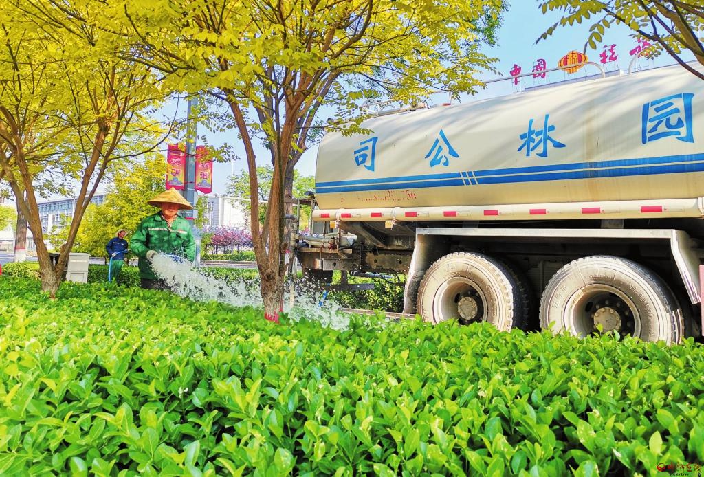 5月21日,園林工人在忻州城區(qū)長征西街澆灌綠化帶。近期氣溫上升,苗木需水量變大,園林工人每天三次為綠植補(bǔ)充水分,確保文明城市花園綠地郁郁蔥蔥。 (宮清華 攝