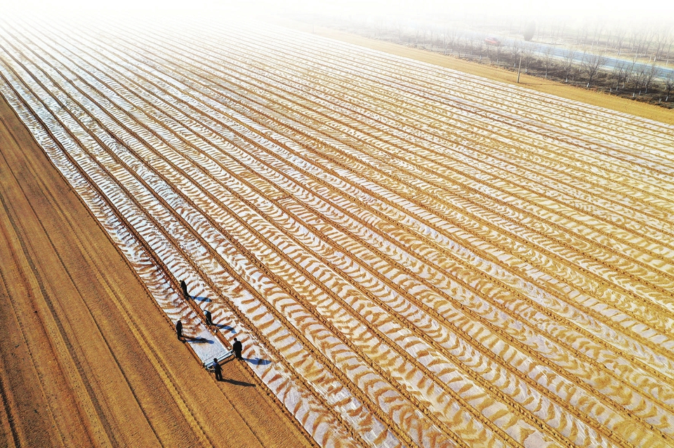 3月24日,在運城市北部峨嵋?guī)X上聞喜縣畖底鎮(zhèn)西畖底村,村民抓緊為中藥材防風覆蓋地膜保墑保苗(無人機照片)。連日來,運城市農(nóng)民搶抓農(nóng)時科學(xué)種植中藥材,為新種植的防風等中藥材精心覆蓋地膜,節(jié)能保墑保苗保質(zhì)量,助力增產(chǎn)增收。從空中俯瞰,田間覆蓋的地膜與農(nóng)民勞作的身影相映成趣,宛如一幅精美的現(xiàn)代農(nóng)耕畫卷。高新生攝