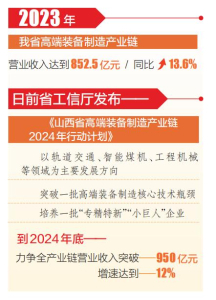 省工信廳日前發(fā)布《山西省高端裝備制造產業(yè)鏈2024年行動計劃》,確立年度推進目標:以軌道交通、智能煤機、工程機械等領域為主要發(fā)展方向,突破一批高端裝備制造核心技術瓶頸,培養(yǎng)一批“專精特新”“小巨人”企業(yè),提升全產業(yè)鏈科技創(chuàng)新能力,強化高端裝備制造供應鏈穩(wěn)定性和配套能力。并提出,到2024年底,力爭全產業(yè)鏈營業(yè)收入突破950億元,增速達到12%。