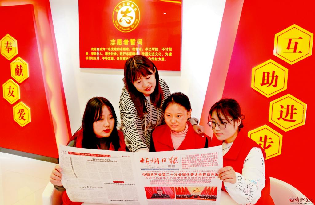 10月19日,忻府區(qū)新時(shí)代文明實(shí)踐中心工作人員正在閱讀報(bào)紙,學(xué)習(xí)黨的二十大報(bào)告。 (本報(bào)記者 張存良攝)