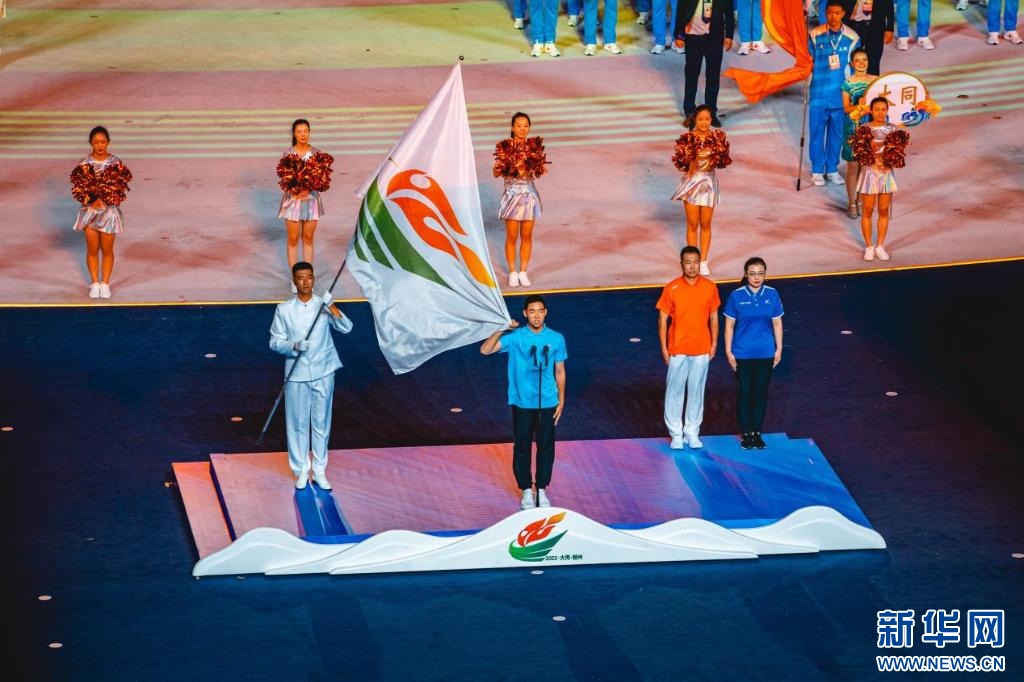 ??山西省運(yùn)動(dòng)會(huì)會(huì)旗、第十六屆省運(yùn)會(huì)會(huì)旗入場(chǎng)。新華網(wǎng) 發(fā)(馬夢(mèng)迪 攝)