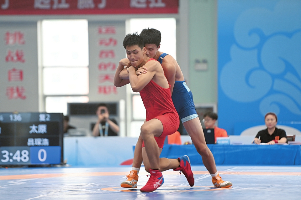 8月17日,省第十六屆運(yùn)動會古典式摔跤比賽舉行,運(yùn)動員們進(jìn)行技術(shù)與力量的比拼。本報(bào)記者阮洋攝