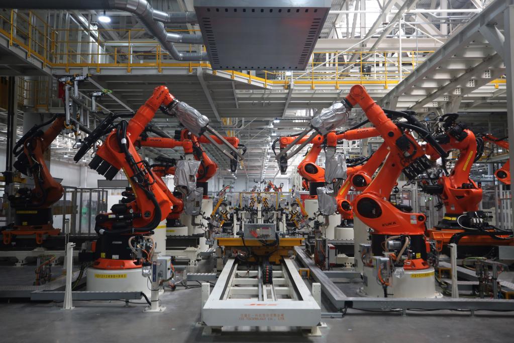 5月29日在合肥拍攝的大眾安徽模塊化電驅(qū)動(dòng)平臺(tái)工廠車身車間一角。新華社記者杜瀟逸 攝