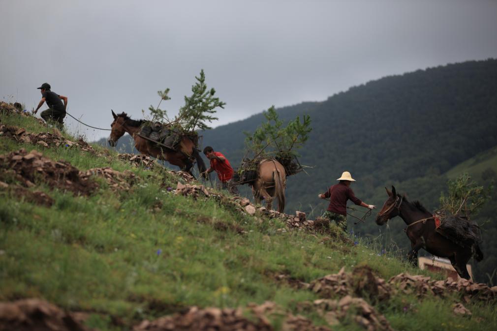 在承德豐寧滿族自治縣千松壩林場(chǎng),群眾將樹苗運(yùn)往山上。王立群 攝