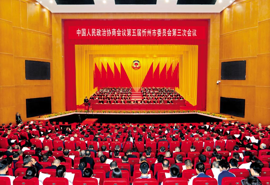 忻州大劇院大劇場布置簡樸,莊嚴隆重。會場內(nèi),燈光璀璨,氣氛熱烈。中國人民政治協(xié)商會議會徽懸掛在主席臺正中,十面鮮艷的紅旗分列兩側(cè)。會場后方高高懸掛著大紅條幅:以習近平新時代中國特色社會主義思想為指導(dǎo),推動中國式現(xiàn)代化忻州實踐邁出堅實步伐!