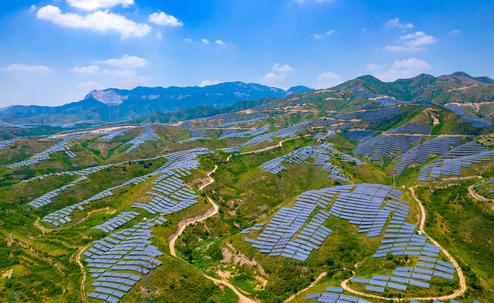 2023年7月18日,在山西省運城市稷山縣100MW光儲一體化項目基地,一排排整齊的光伏板與遠(yuǎn)處的青山交相輝映。近年來,稷山縣因地制宜流轉(zhuǎn)荒山荒坡發(fā)展光伏產(chǎn)業(yè),增加農(nóng)民收入,助力鄉(xiāng)村振興。(山西省委辦公廳 供圖)