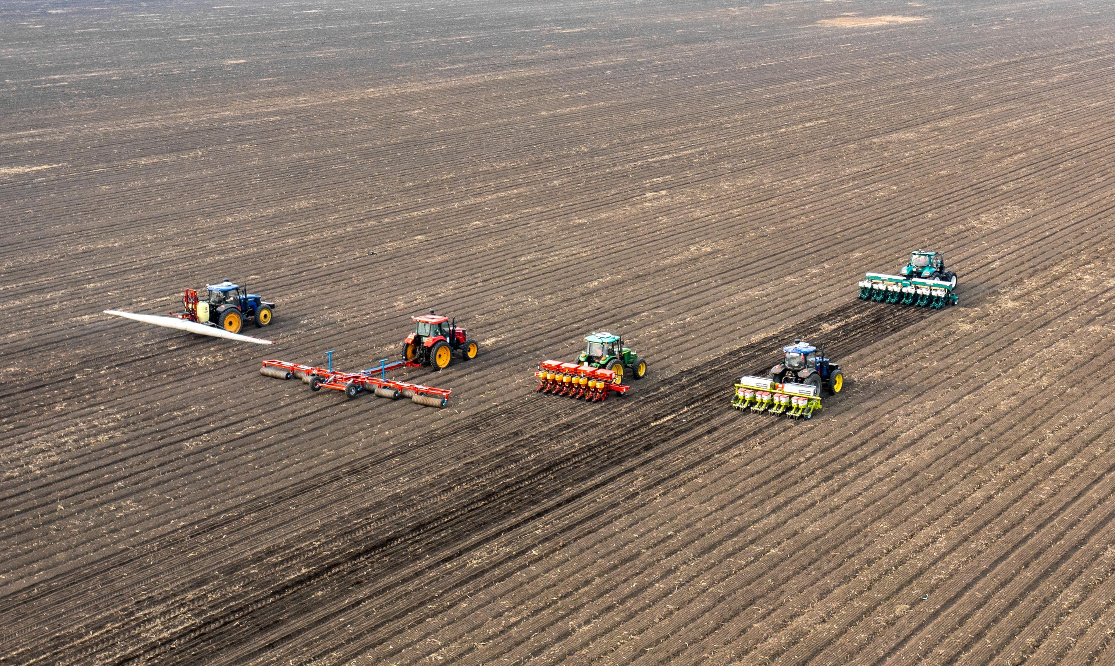 △2023年春,黑龍江雙鴨山,北大荒農業(yè)股份友誼分公司第五管理區(qū)玉米智能機械化作業(yè)播種現(xiàn)場。