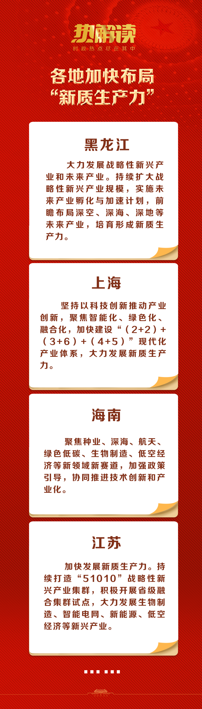 加快發(fā)展新質(zhì)生產(chǎn)力已成為2024年推進經(jīng)濟社會高質(zhì)量發(fā)展的主旋律。各地搶抓機遇,紛紛布局。在各省區(qū)市2024年政府工作報告中,多地將加快培育新質(zhì)生產(chǎn)力列為重點工作任務。
