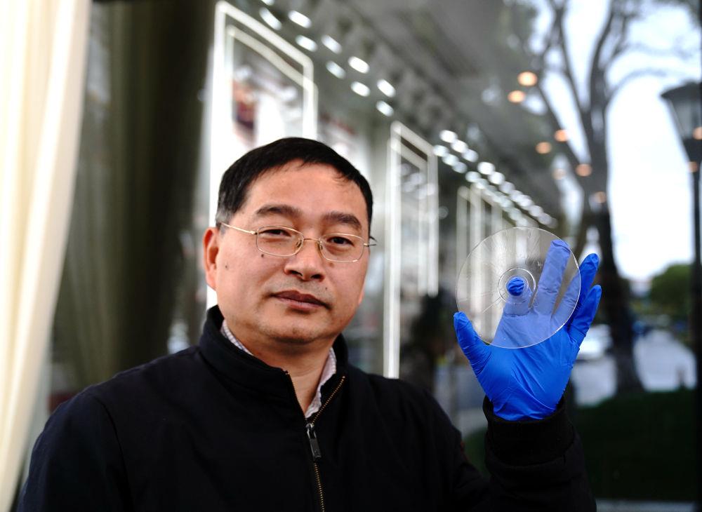 △2024年2月21日,上海光機(jī)所阮昊研究員展示“超級光盤”。