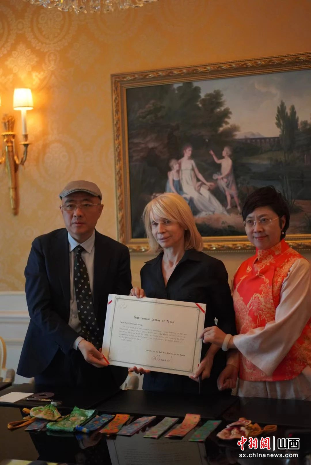 潞綢技藝傳承人、潞安府潞綢集團董事長王淑琴,太湖世界文化論壇常務(wù)理事、中國琺華技藝傳承人于山向巴黎名媛舞會創(chuàng)始人奧菲莉·雷努阿贈送潞綢、琺華工藝品。
