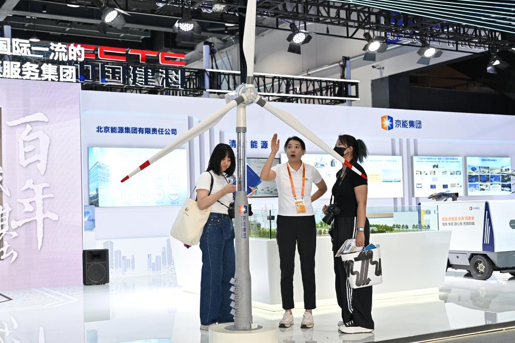 參觀者在服貿會首鋼園區(qū)京能集團展臺觀看一款新型風機模型。新華社記者 李鑫 攝