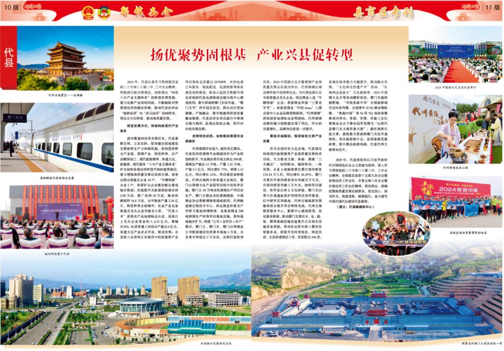 2024年,代縣認(rèn)真學(xué)習(xí)貫徹落實(shí)黨的二十大和二十屆二中、三中全會(huì)精神,積極踐行新發(fā)展理念,創(chuàng)新提出“構(gòu)筑八大產(chǎn)業(yè)支撐體系”的轉(zhuǎn)型發(fā)展思路,著力化解產(chǎn)業(yè)結(jié)構(gòu)風(fēng)險(xiǎn),不斷破除對(duì)資源型經(jīng)濟(jì)的路徑依賴,推動(dòng)代縣經(jīng)濟(jì)由“獨(dú)鐵經(jīng)濟(jì)”向“多元經(jīng)濟(jì)”結(jié)構(gòu)轉(zhuǎn)變,深化全方位轉(zhuǎn)型、推動(dòng)高質(zhì)量發(fā)展。